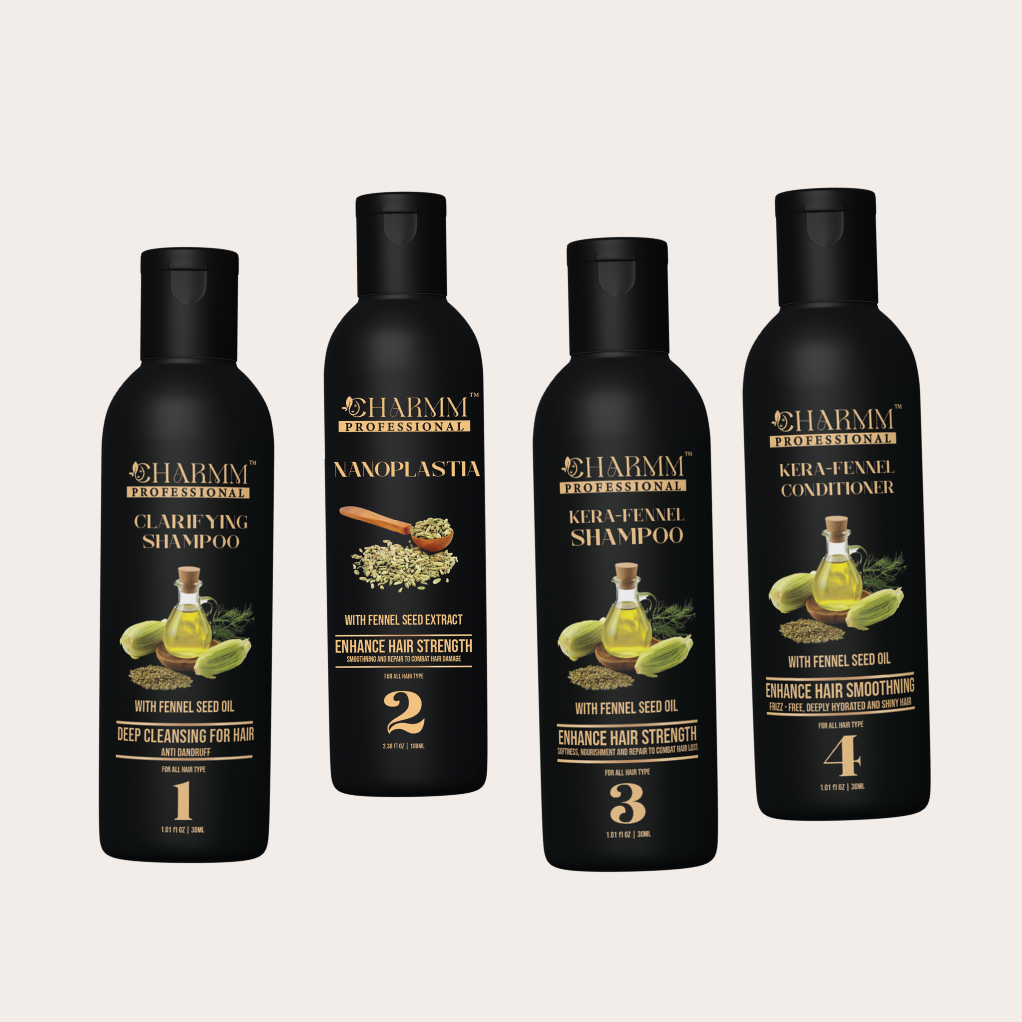 Introducing our premium collection, designed to elevate your hair care routine. This all-inclusive kit features four essential products: clarifying shampoo, nanoplastia, kera-fennel shampoo, and kera-fennel conditioner. Each product is meticulously crafted to cater to all hair types, ensuring your hair receives the best treatment possible.
